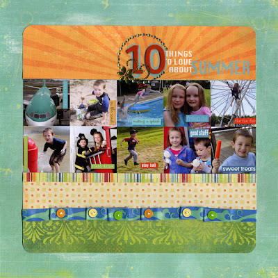 I used the paper as inspiration for this layout and found photos of 10 things we love about Summer. I used Katie Pertiet‘s Cut-Ups:Summertime to label the photos. I also had a little fun pleating the ribbon 🙂The kit includes a cool mini-album that has chipboard, acrylic and felt pages. I used the mini-album pages on my layouts — this one uses one of the acrylic pages. I also cut up a Basic Grey bling flower and used it as water drops. The cluster frames here are by Katie Pertiet, as usual!