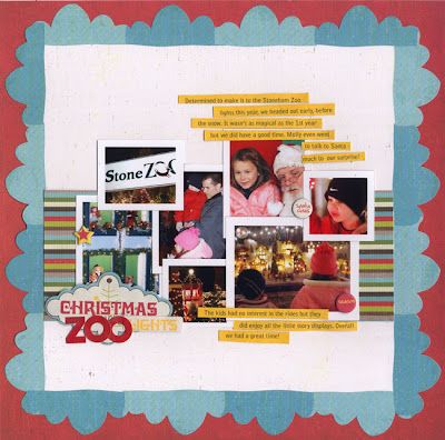 Next -the Christmas Zoo Lights. I printed out my photos using a digital cluster frame by Katie Pertiet. I love using those pre-made stickers for titles – I combined a few here. The main sticker actually said Christmas morning, but I covered over the morning with other stickers. I picked up the yellow in the title with my journaling strips. I really like the yellow in this line — it’s such an unusual color for Christmas but it works so well. And that stripe. I’m hoarding it!