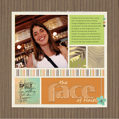 Ever since the earthquake, Haiti has never been far from my mind. I felt a personal connection because my fellow Designer Digitals creative team member Christina lives at Port Au Prince – I think about her every day living with the devastation, worrying about family and friends. Having met Christina last year I know what a caring person she is but I am constantly amazed at her strength and her determination in her efforts to help her fellow Haitians in this time of need. The design team at Designer Digitals got together to create the Help Haiti Collaborative Collection a beautiful kit with oodles of papers, embellies, a very cool acrylic alpha and more. 100% of the proceeds for this kit will be give to Mercy Corp. Here’s a page I made using Cathy Zielske‘s layered template included in the kit.