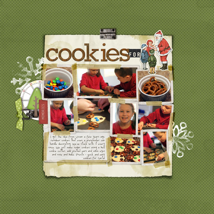 Oops. Here we are half way through December almost and I’m so far behind in posting. I missed telling you all about the December Write.Click.Scrapbook gallery and the theme for this month. Not to worry, there’s still time to check it all out. The gallery theme for December is: holiday food and drink. You can check out Elizabeth Marnie’s* intro here (Elizabeth tells me that Marnie writes the intros – my apologies Marnie!)- I especially like how she worked in the fact that I stole my cookie idea from Vivian (who also used it as the subject for her layout!). Here’s my layout:
