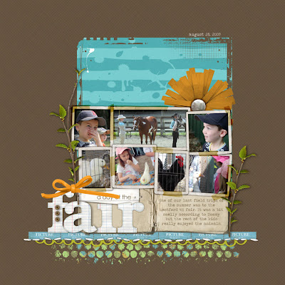 I don’t do a whole lot of 2-page layout but I do when I have a lot of photos I want to use. Case in point: photos from a fair we went to two years ago. None of them were stellar, and in a strange way, I feel like I needed to use more of the photos because none of the photos individually were calling out to be scrapped. So there they sat, on my hard-drive until I saw a new Studio DD layer works template (#67) and thought I could turn it into a two-pager. Here’s the first page:-